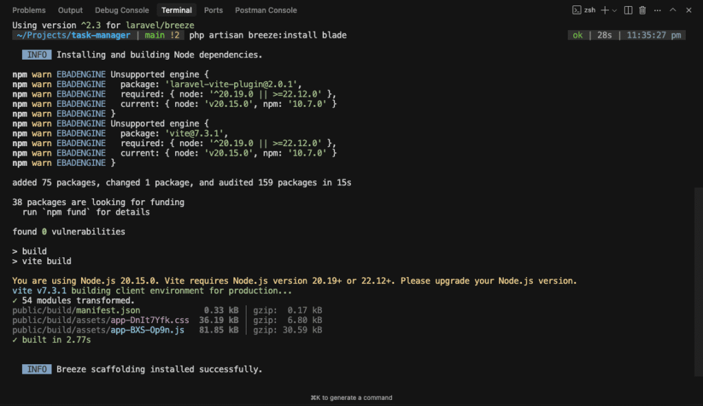 Let’s start by installing Laravel Breeze in our Task Manager project.