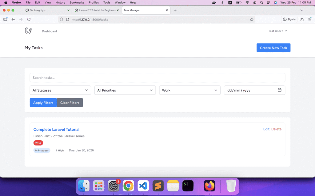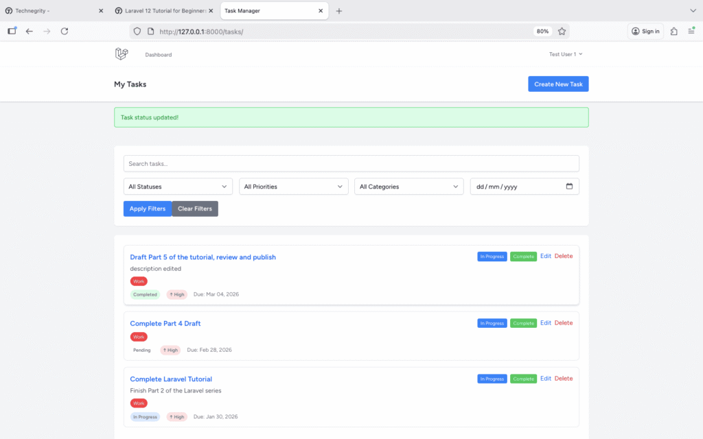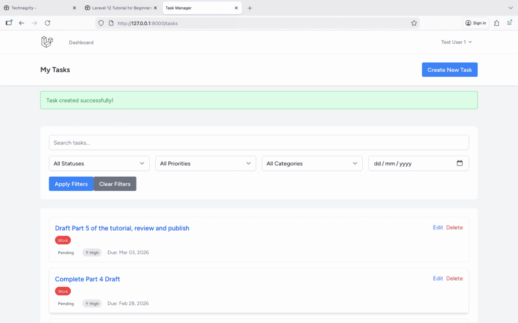 By the end of this tutorial, you’ll have a fully functional task management system where users can create, view, edit, delete, search, and filter their tasks.