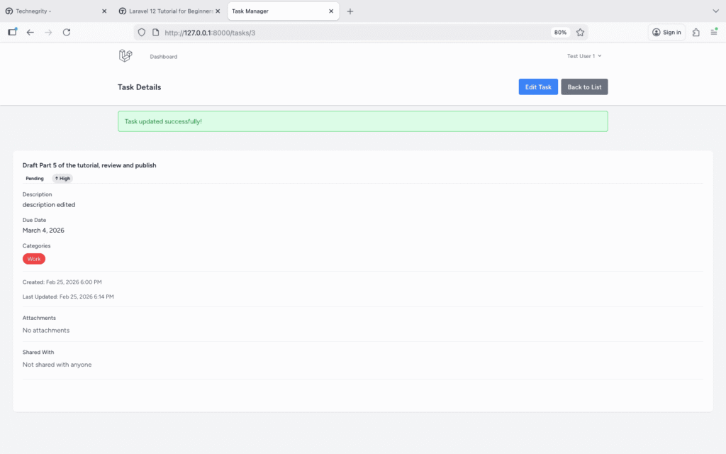 Welcome back to our Laravel 12 Task Manager series! In Part 1, we set up our development environment, and in Part 2, we implemented authentication and designed our database structure. Now it’s time to bring our Task Manager to life by building complete CRUD (Create, Read, Update, Delete) operations.