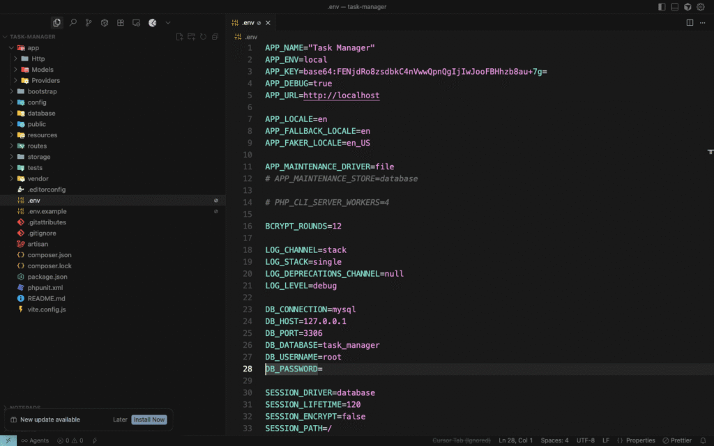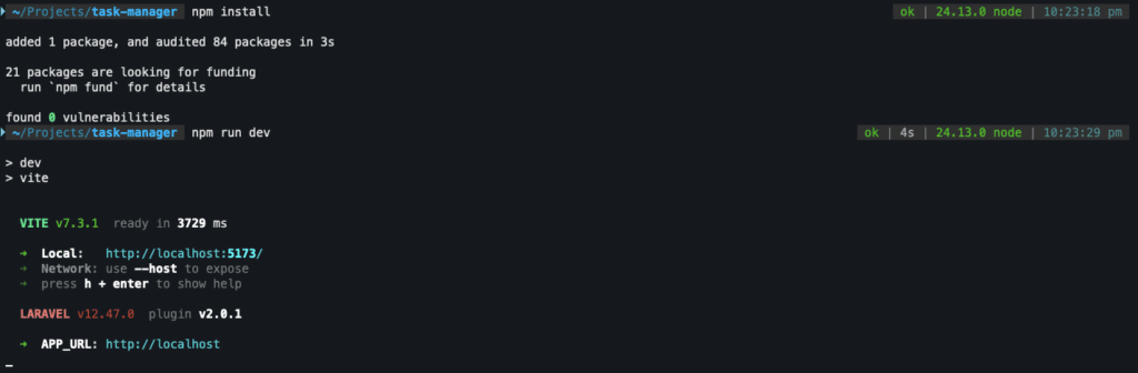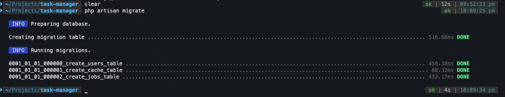 cd C:/laragon/www # Windows (Laragon) cd ~/Sites # macOS cd ~/projects # Linux - Create a new Laravel project named “task-manager”:
